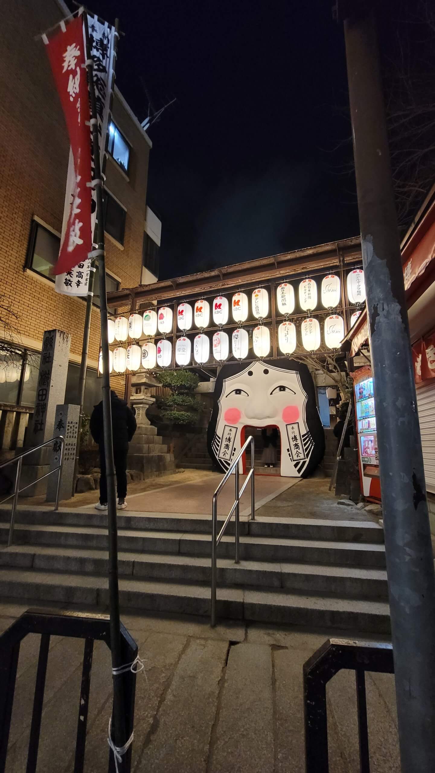 夜になると、楼門の「お多福面」や境内の提灯に明かりが灯ります。